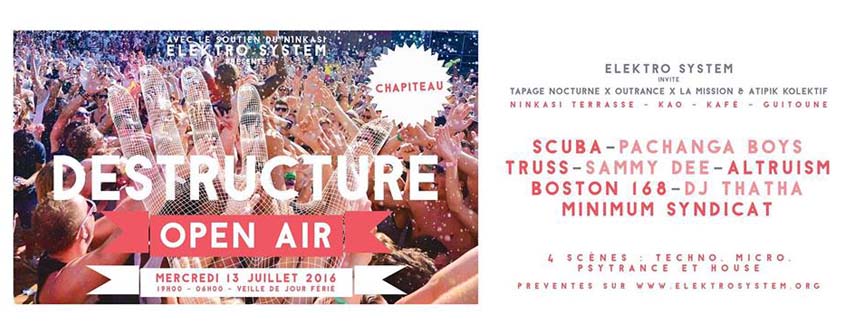 | 15,99€Avec le soutien du Ninkasi, Elektro System présente : OPEN AIR DESTRUCTURE !